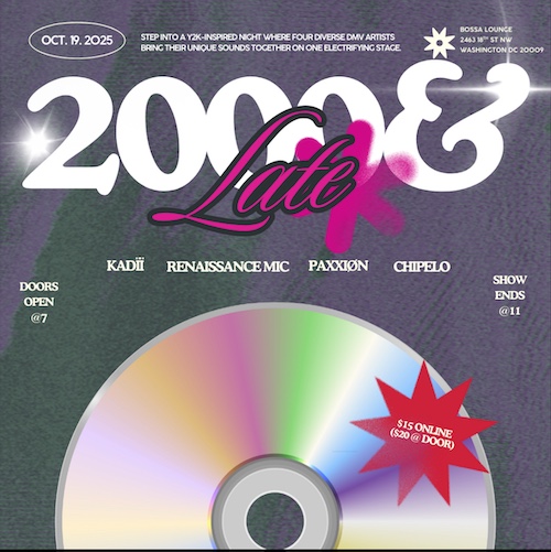 Step into a Y2K-inspired night in which four diverse DMV artists – Kadïï, Renaissance Mic, Paxxiøn, and Chipelo – bring their unique sounds together! Get ready to groove to a multitude of genres and blends of old- and new-school music. Don’t be fashionably late, be 2000 & Late!
